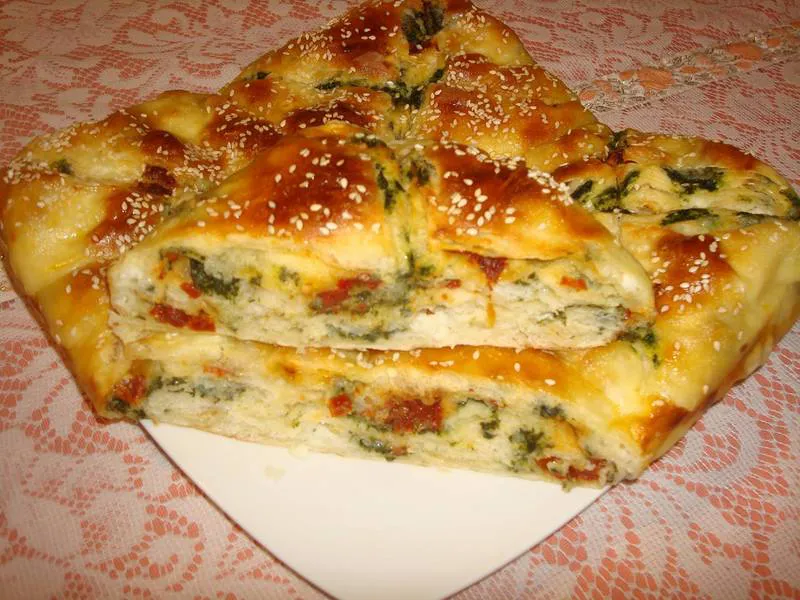 Вкусна питка баница с тривцветна плънка - сирене, спанак и сушени домати