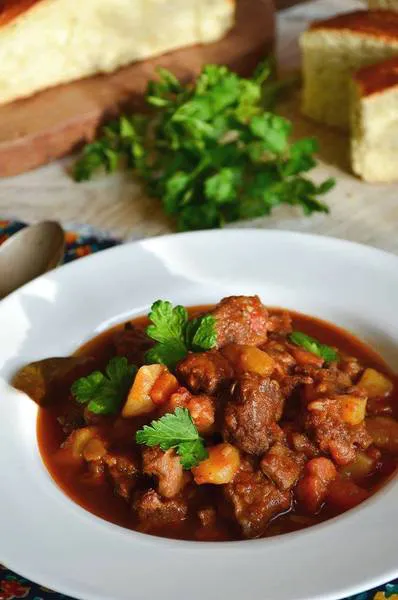 Това е гъста и богата гозба, пълни с малки парчета телешко месо, лук, чесън, моркови и картофи, които играят ролята на сгъстителите и подправена с дафинови листа, червен пипер и черен пипер. Едно от любимите ми ястия с телешко месо е Унгарския Гулаш, който според мен е най-добре да се приготви на предишния ден преди да бъде консумиран. Това засилва ароматите и ги обединява, но разбира се, можете да го хапвате и в деня в който го направите. Бавно готвенето месо и зеленчуците правят гозбата невероятно плътна и много вкусна.