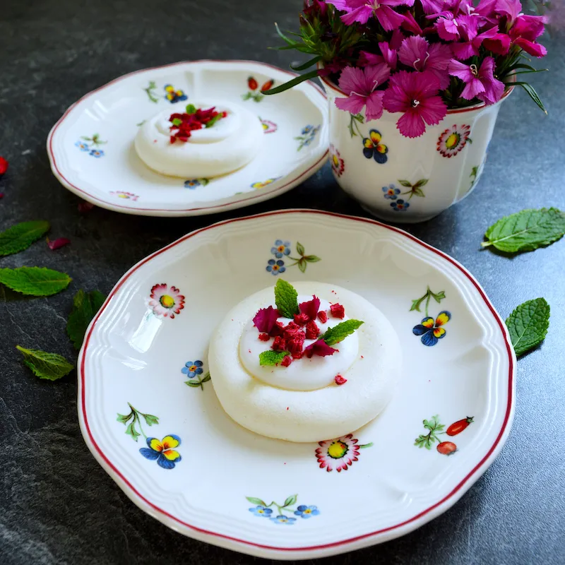 Лек и въздушен веган десерт, приготвен от хрупкав меренг въз основата на аквафаба и лек и ароматно приятен разбит кокосов крем, посипан със свежи листа от мента и уханни натрошени дехидрирани малини.