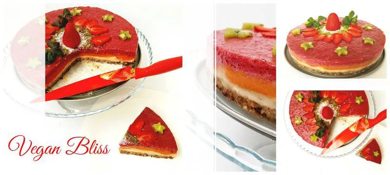 Безкомпромисно вкусна веган плодова торта без бяла захар и брашно, с основа от ядки и сушени плодове и трислоен крем от банани, тиква и ягоди.