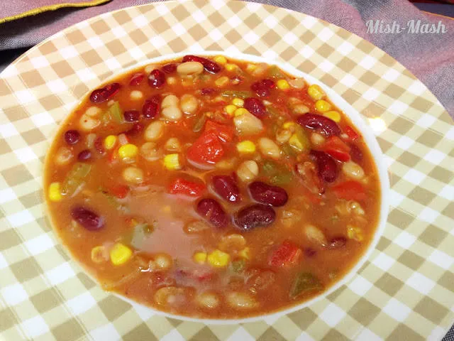 Много бързо и вкусно вегетарианско ястие с чушки, царевица и два вида зрял боб.
