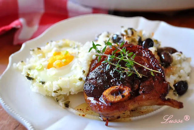 Хрупкавата кожичка на джоланчето, глазираното месце, в комбинация с уханието на прясна мащерка и гарнитура от бял ориз със зелен лук, маслини и яйца.