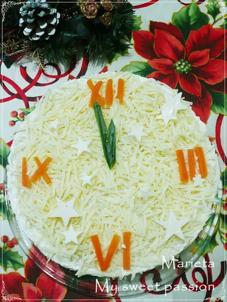 Много вкусна зимна салаа, която може да се оформи като салата Новогодишен часовник