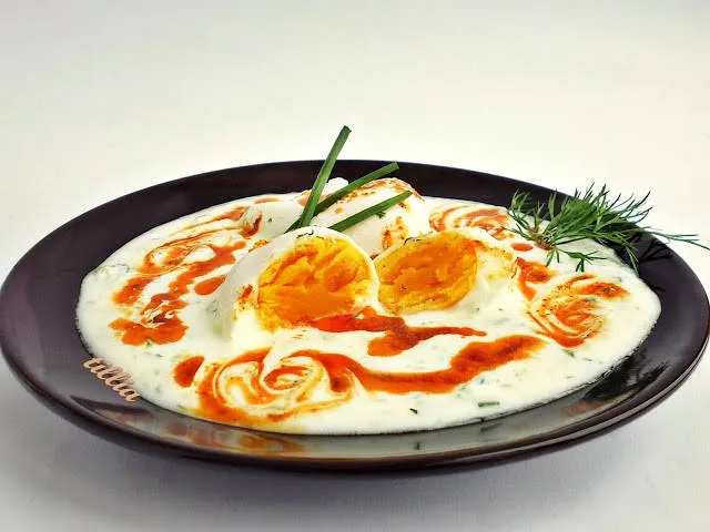 Забулени яйца с млечно чеснов сос
