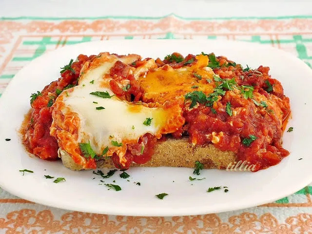 Забулени яйца в доматен сос, върху канапе от препечени филии