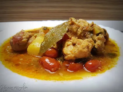 Заешко месо с картофи, вино и домати