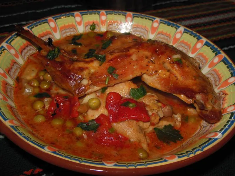 Заешко с грах и печени чушки