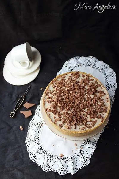 - Разбийте сиренето с миксер в голяма купа, добавете сметаната и захарта и разбийте отново до получаването на гладък крем. Сложете сладоледа в голяма купа и започнете да добавяте сместа с крем сиренето, а след това ликьора и кафето, като бъркате постоянно до хомогенизиране. Изсипете получената смес във формата, покрийте със стреч фолио и приберете във фризера. Замразявайте за поне 4 часа или за през нощта (можете да съхранявате тортата замразена до 1 месец).