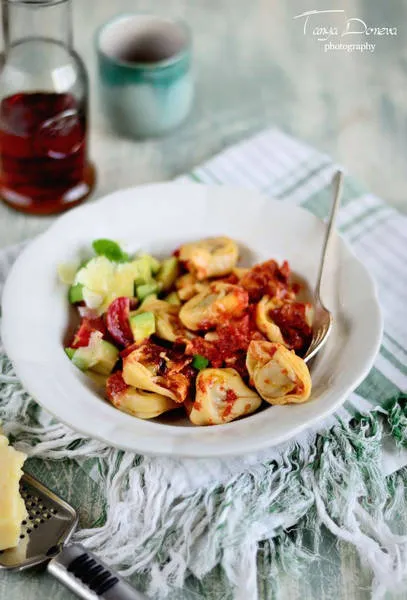 Запечени тортелини с чедър и доматен сос