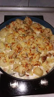 Запеканка с картофи, шунка и кисели краставички