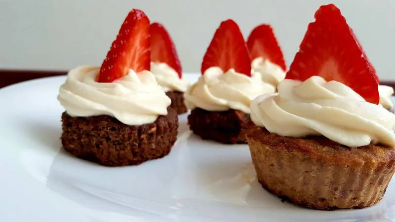 Опитайте тези симпатични, елегантни и здравословни бананови мъфини с кокосово брашно, фурми, ядки и нежна глазура от рикота, ягоди и кленов сироп.