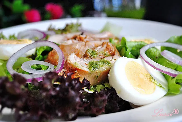 Зелена салата с кажунско пилешко и яйца