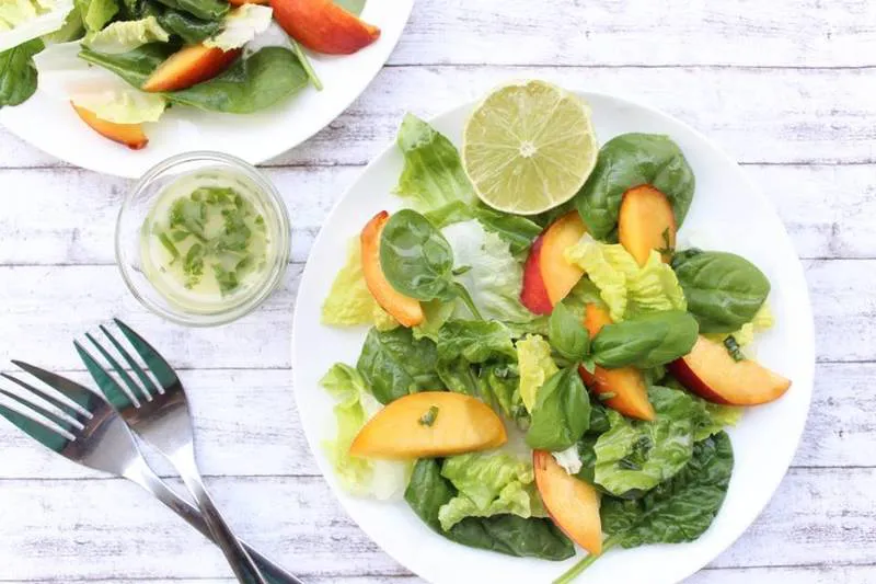 Салата от пресни, летни зеленолистни зеленчуци, праскови и един нежен дресинг с босилек. Плодовете се съчетават учудващо добре с неутралния вкус на зелената салата. Дресингът някак си съединява всички аромати с неговата лимонова свежест