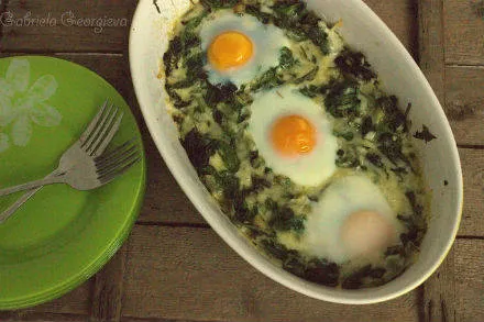 Приготвя се с пиперки и домати, като отгоре се готвят яйца. Аз замених пипера и доматите със спанак. Често се приготвя със сирене, аз я приготвих с кашкавал за повече мекота и пухкавост. Е, в крайна сметка получих една различна от познатата ни шакшука, но също толкова вкусна като класическата.