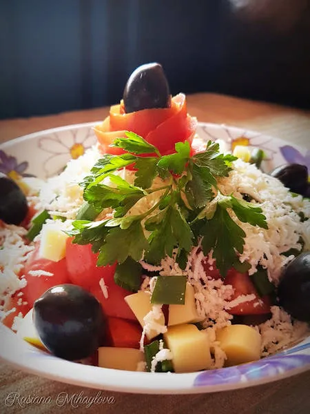 Разбъркайте салатата и я гарнирайте с нарязан кашкавал, настъргано сирене, магданоз и маслини